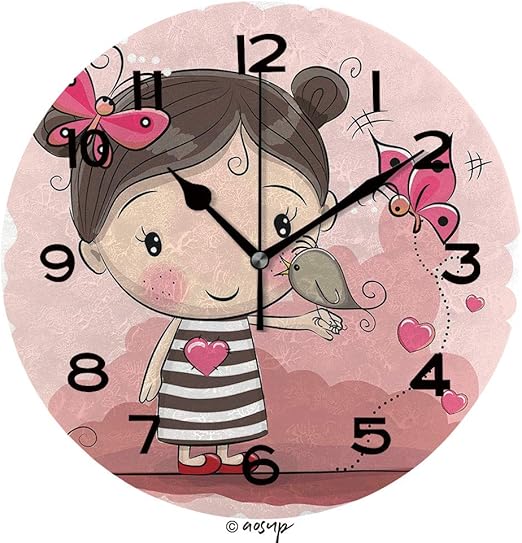 Amazon Com Amauncle 10 Inch Round Clock Cute Cartoon Girl With Bird And Butterflies On A Background Unique Wall Clock For Living Room Bedroom Or Kitchen Use No19476 Home Kitchen