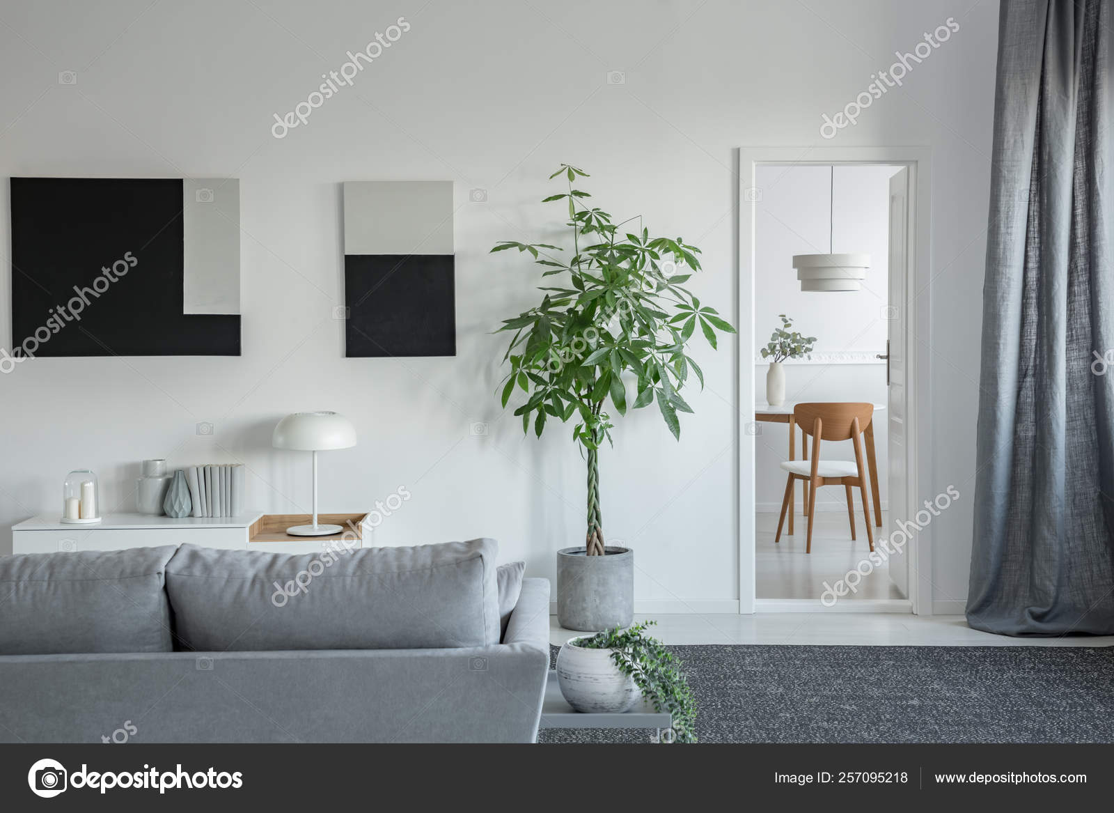 Big Green Plant In Concrete Pot In Bright Living Room Interior