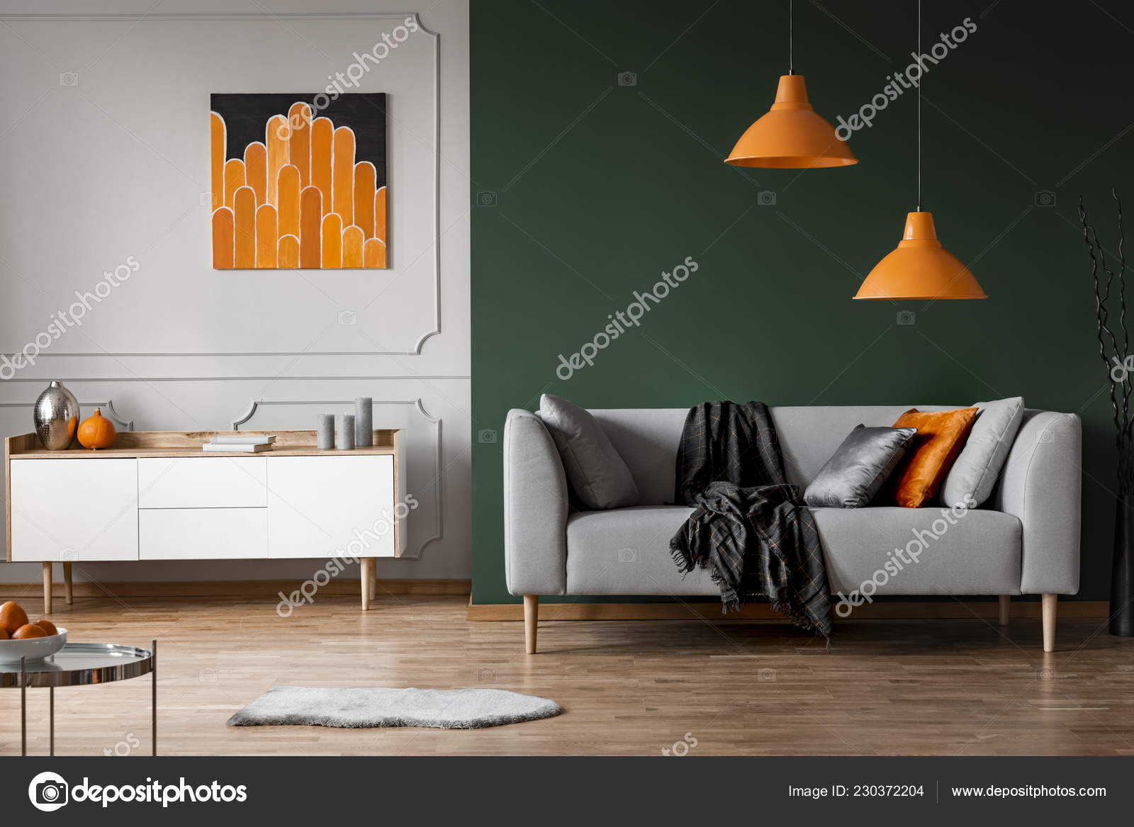 Orange Lamps Grey Couch Black Living Room Interior Poster Cabinet Stock Photo C Photographee Eu 230372204