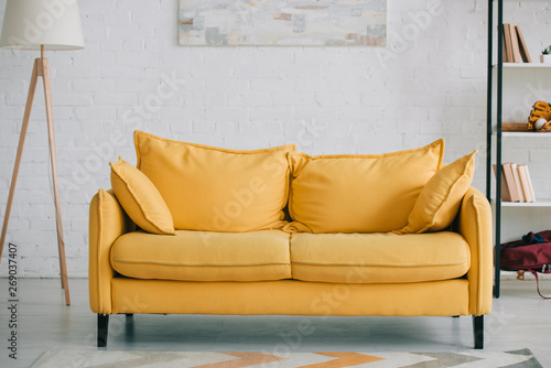 Spacious Light Living Room With Bright Yellow Sofa Floor Lamp