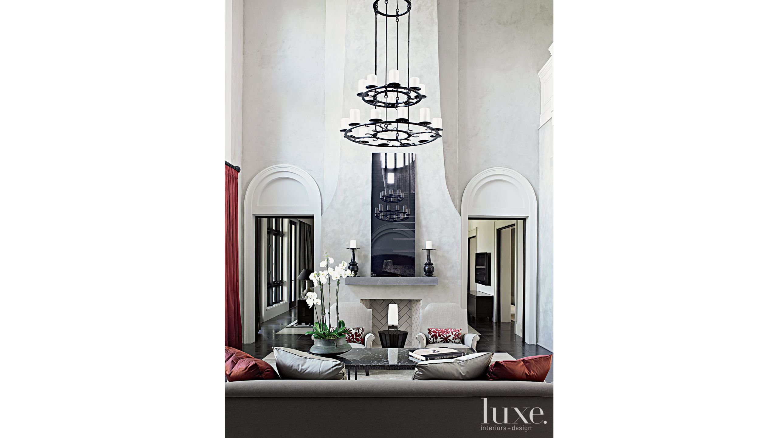 A Large Chandelier Anchors The Double Height Ceilings In This