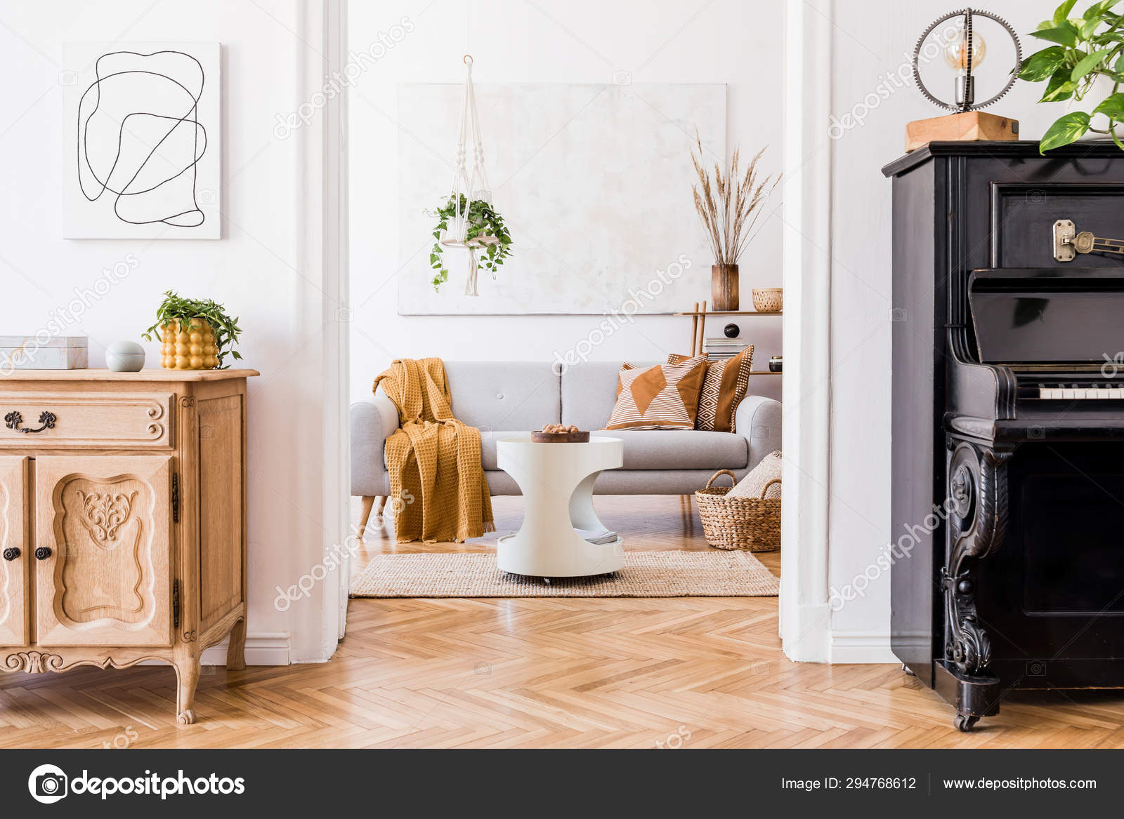 Modern Boho Interior Of Living Room At Cozy Apartment With Gray