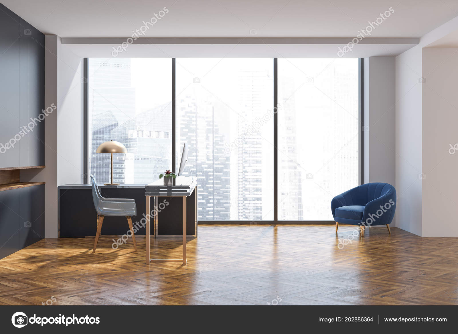 Manager Office Interior Dark Gray Walls Loft Windows Wooden Floor