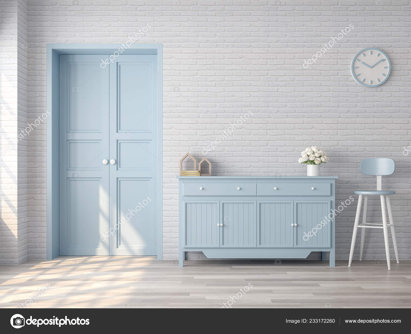 Cabinet Design Modern Living Room With Blue Brick Wall On White