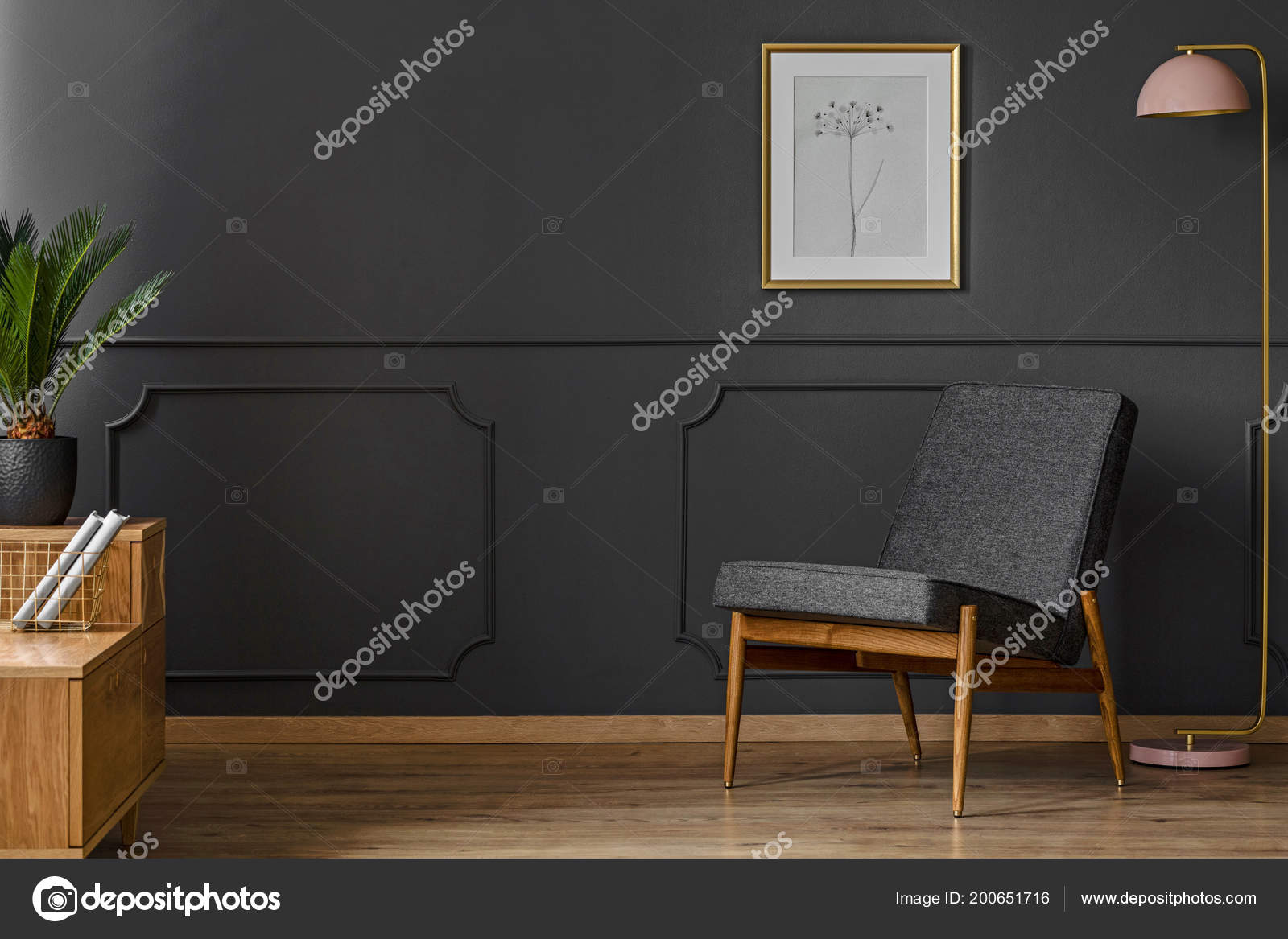 Black Chair Dark Spacious Retro Living Room Interior Lamp Cabinet