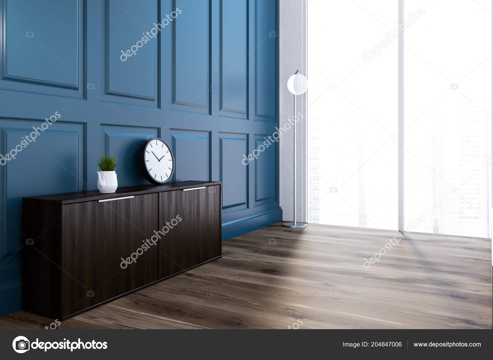 Blue Loft Living Room Interior Wooden Floor Dark Wooden Cabinet