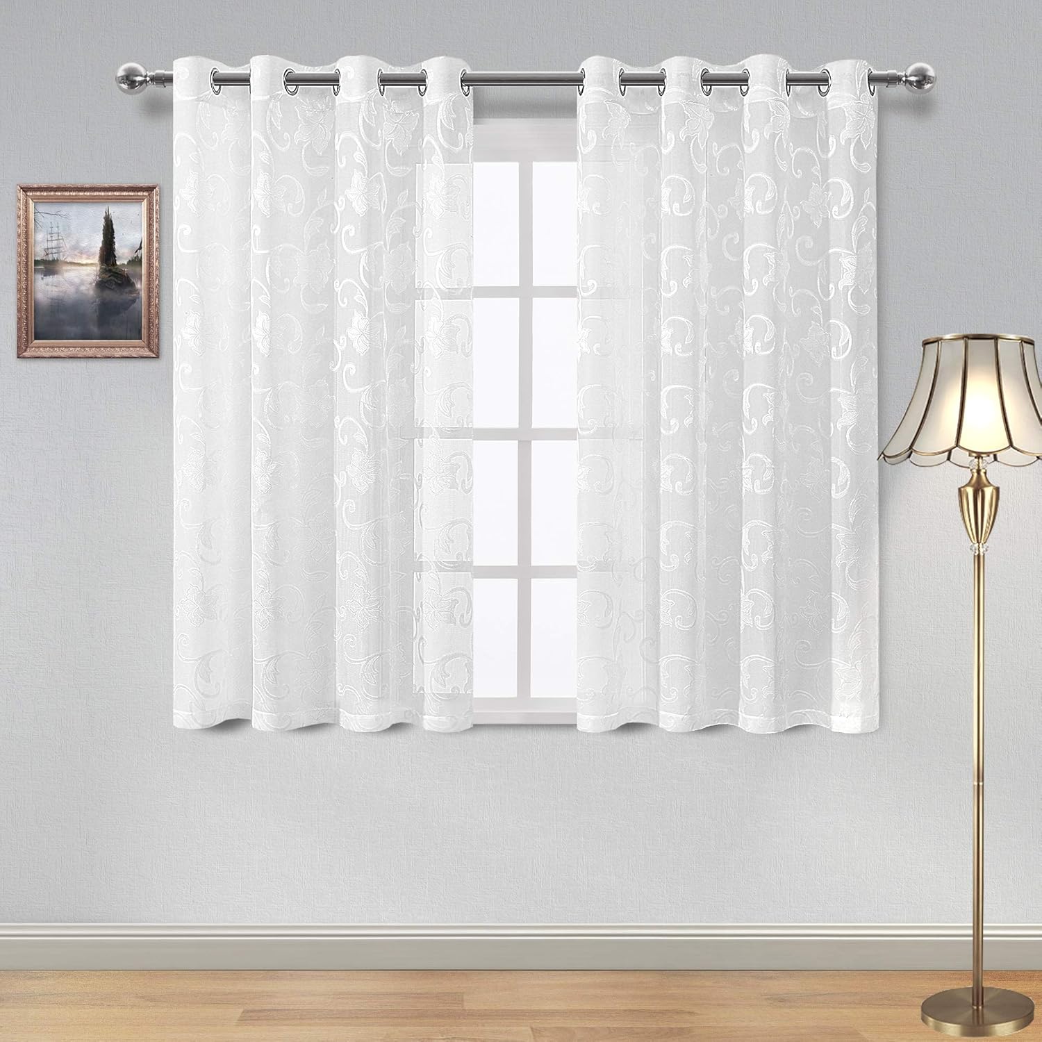 Amazon Com Dwcn White Sheer Curtains Floral Jacquard Faux Linen Grommet Top Semi Voile Bedroom And Living Room Curtains Set Of 2 Window Curtain Panels 52 X 45 Inch Length Home Kitchen