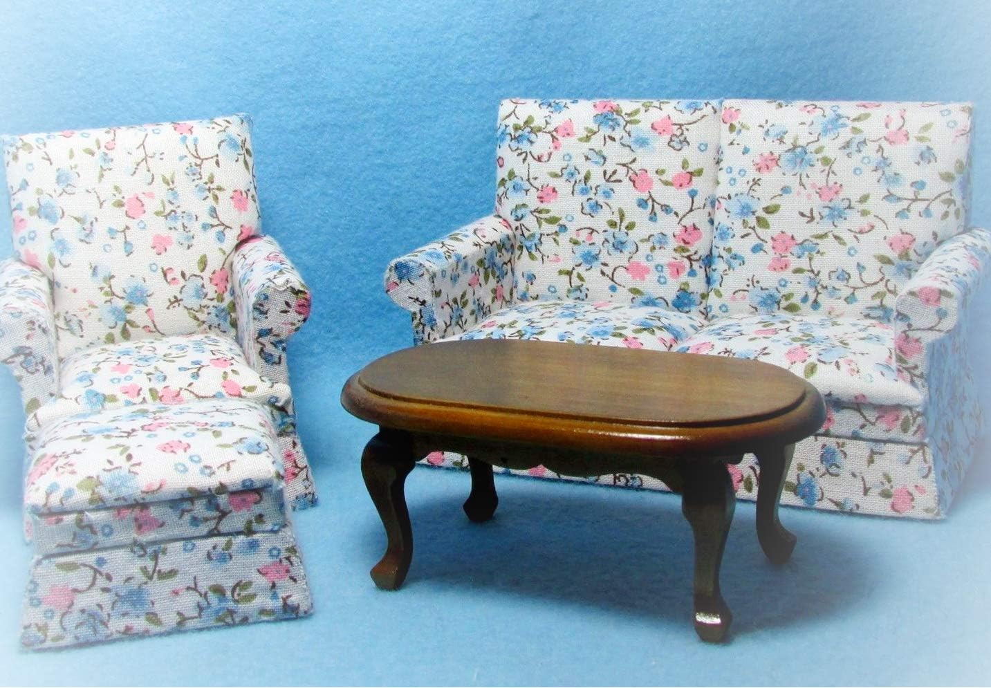 Dollhouse Miniature Complete Living Room Set In Blue Floral 4 Pieces T3576 Ebay