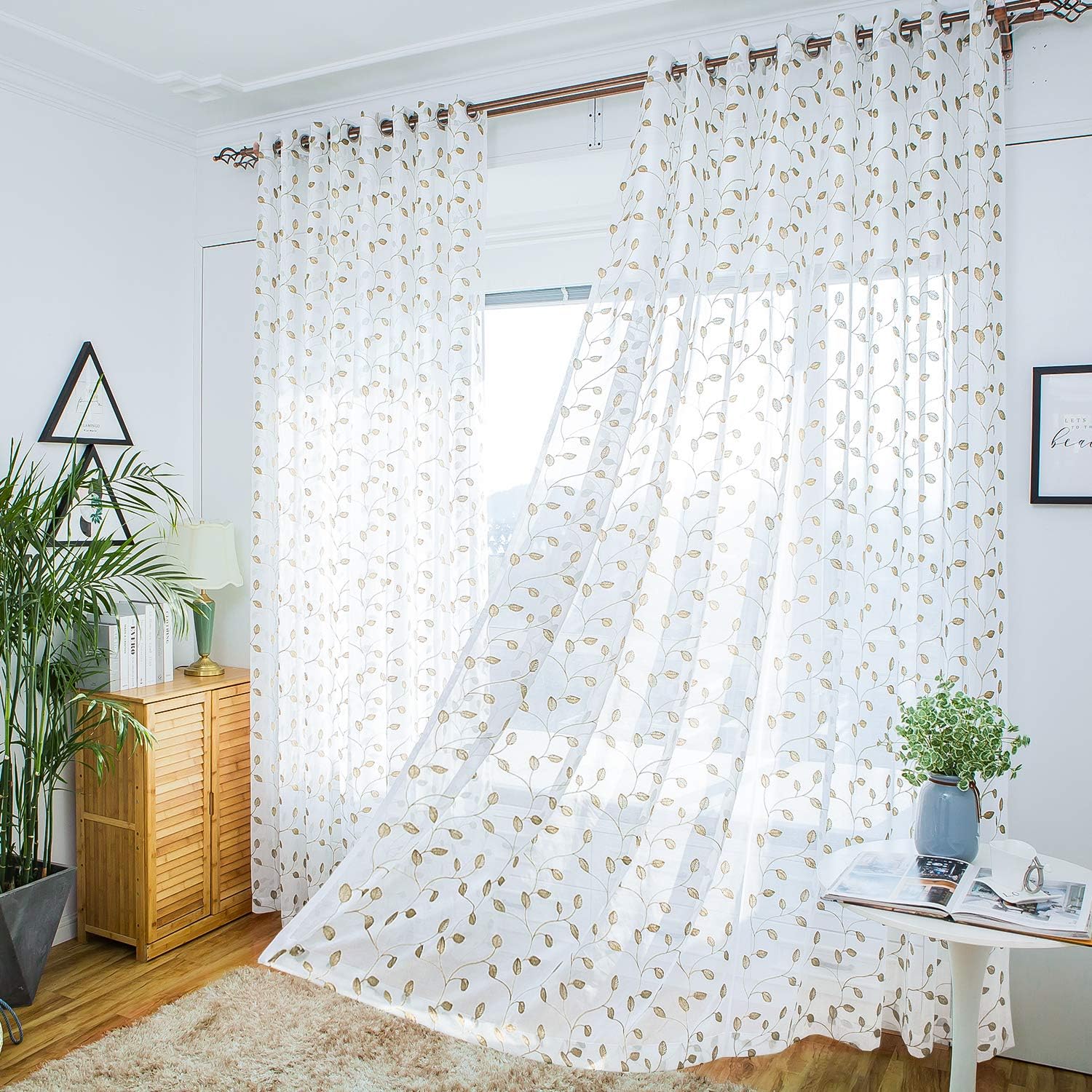 Amazon Com Eamior Sheer Curtains 72 Inches Long Floral Embroidered Voile Sheer Curtain Panels With Grommet Top For Living Room Set Of Two W52 X L72 Gold Leaves Kitchen Dining