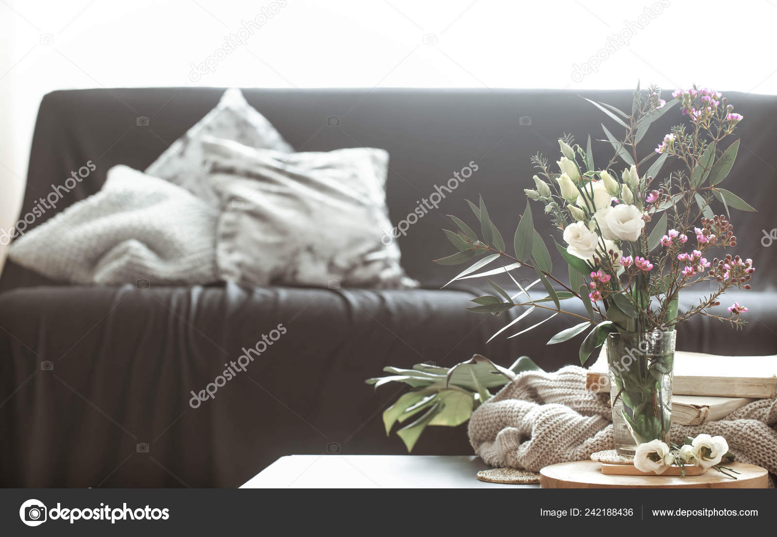 Cozy Home Interior Living Room Black Sofa Vase Flowers Decor