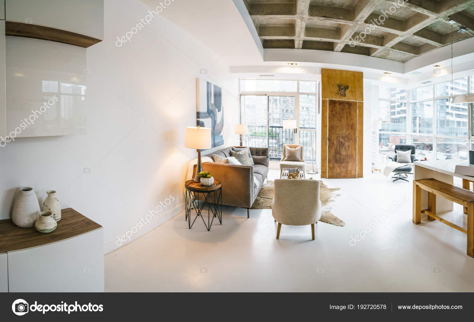 Interior Modern Furnished Living Room Unfinished Ceiling Stock