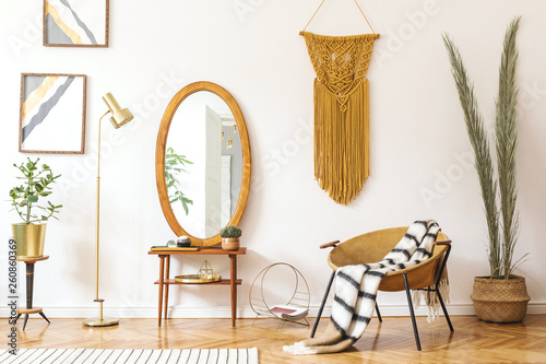 Stylish Interior Of Apartment With Gold Armchair Wooden Mirror