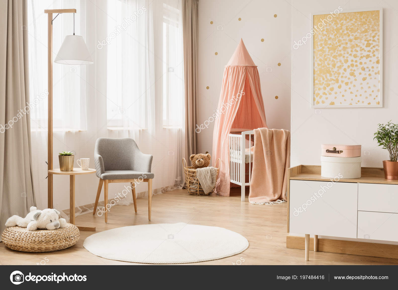 White Rug Scandi Living Room Interior Baby Cradle Gold Poster