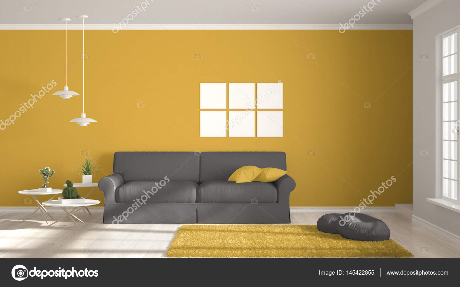 Gray White Wall Living Room Interior Concrete Floor Yellow Sofa