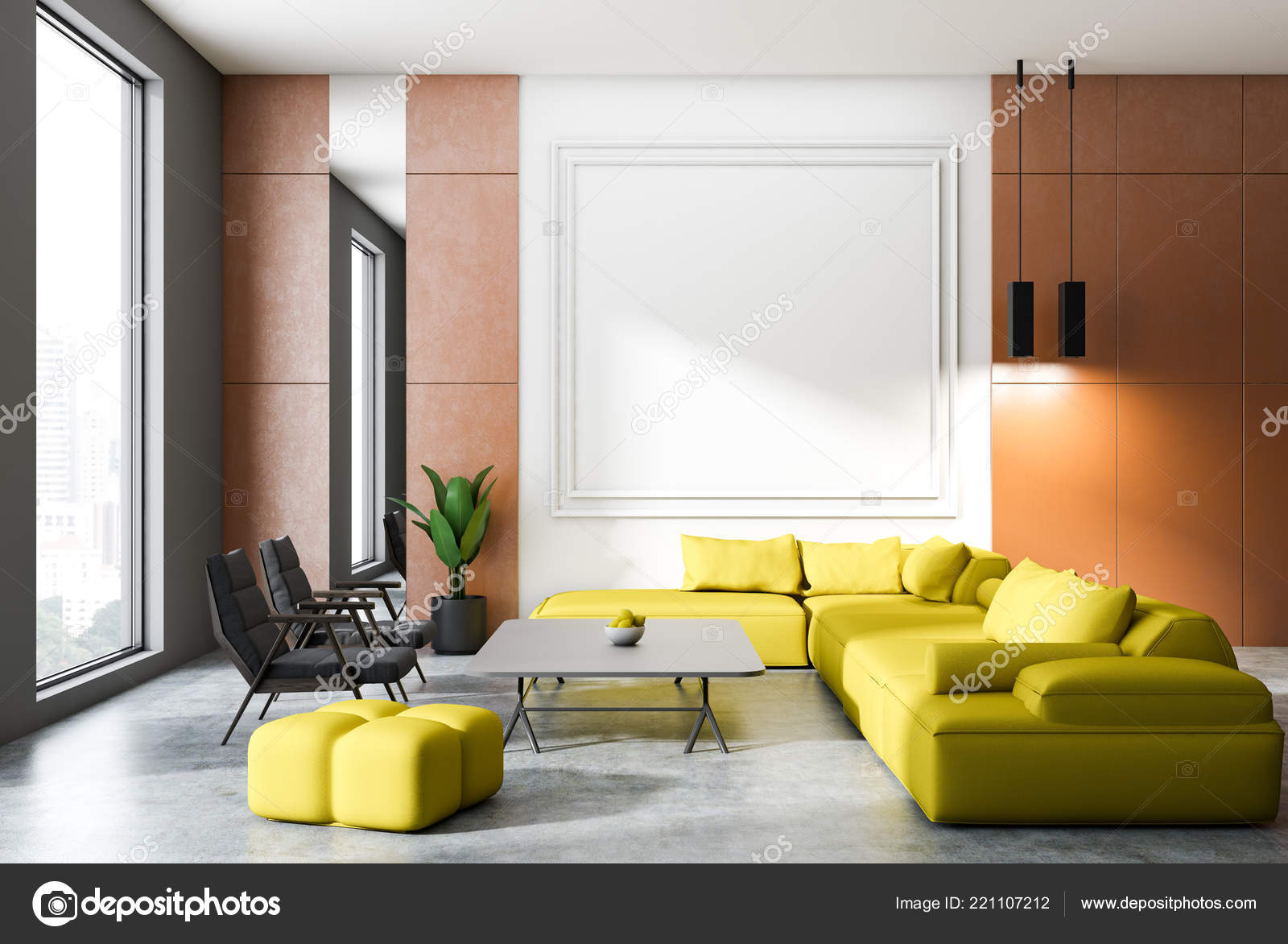Orange White Wall Living Room Interior Concrete Floor Yellow Sofa