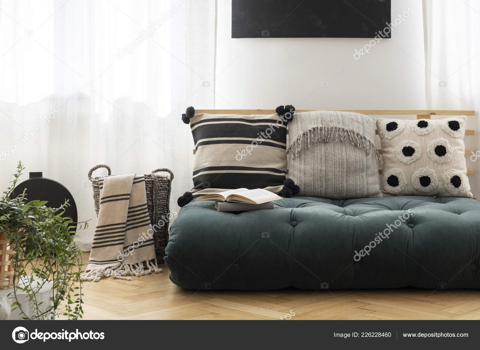 Patterned Cushions Green Futon Bright Living Room Interior Blanket Basket Stock Photo C Photographee Eu 226228460