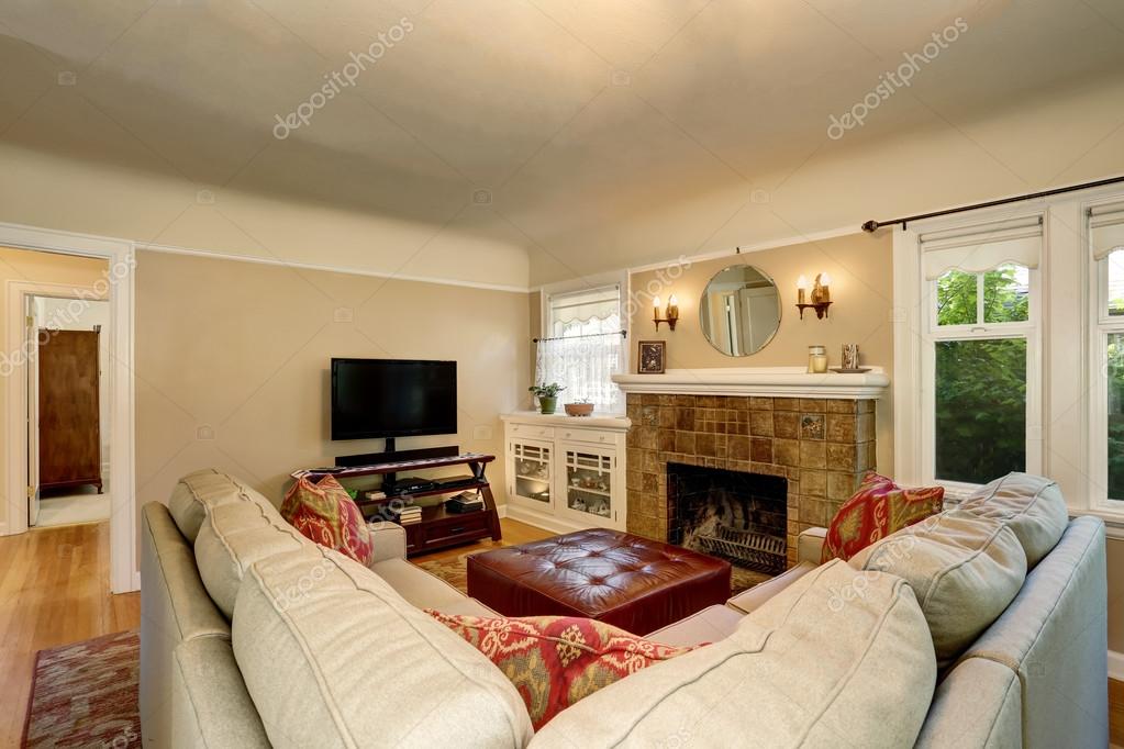 Cozy Living Room Interior With Brick Fireplace Tv Set And Beige