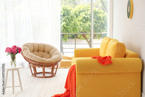 Elegant Living Room Interior With Comfortable Sofa And Papasan