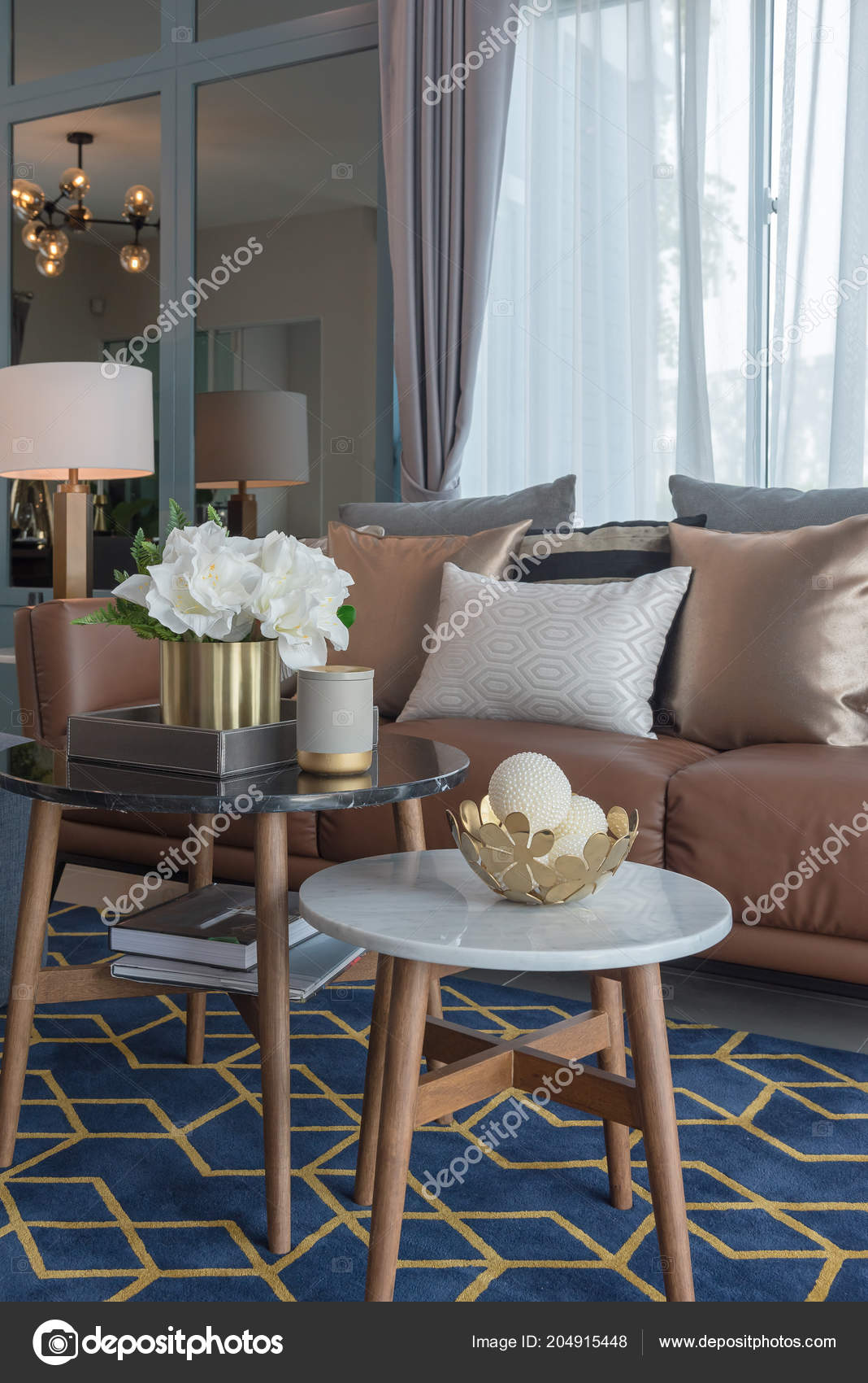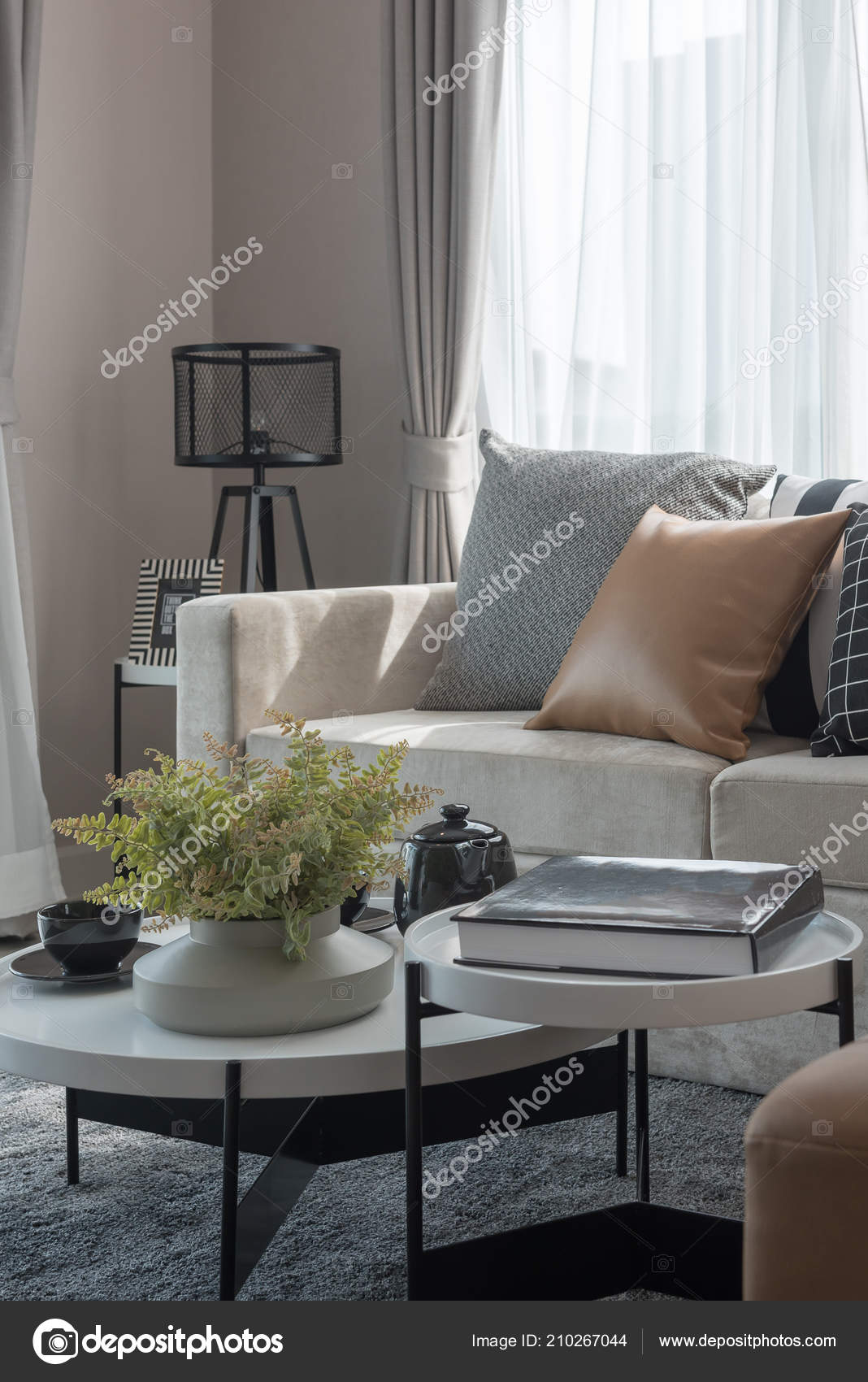 Modern Living Room With Set Of Pillows On Sofa Stock Photo