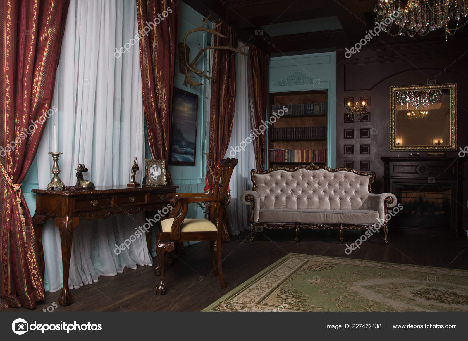 Interior View Of Victorian Style Living Room With A Fireplace And
