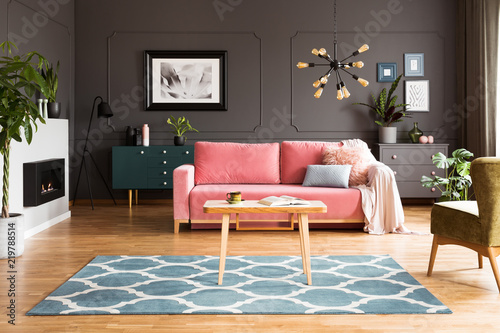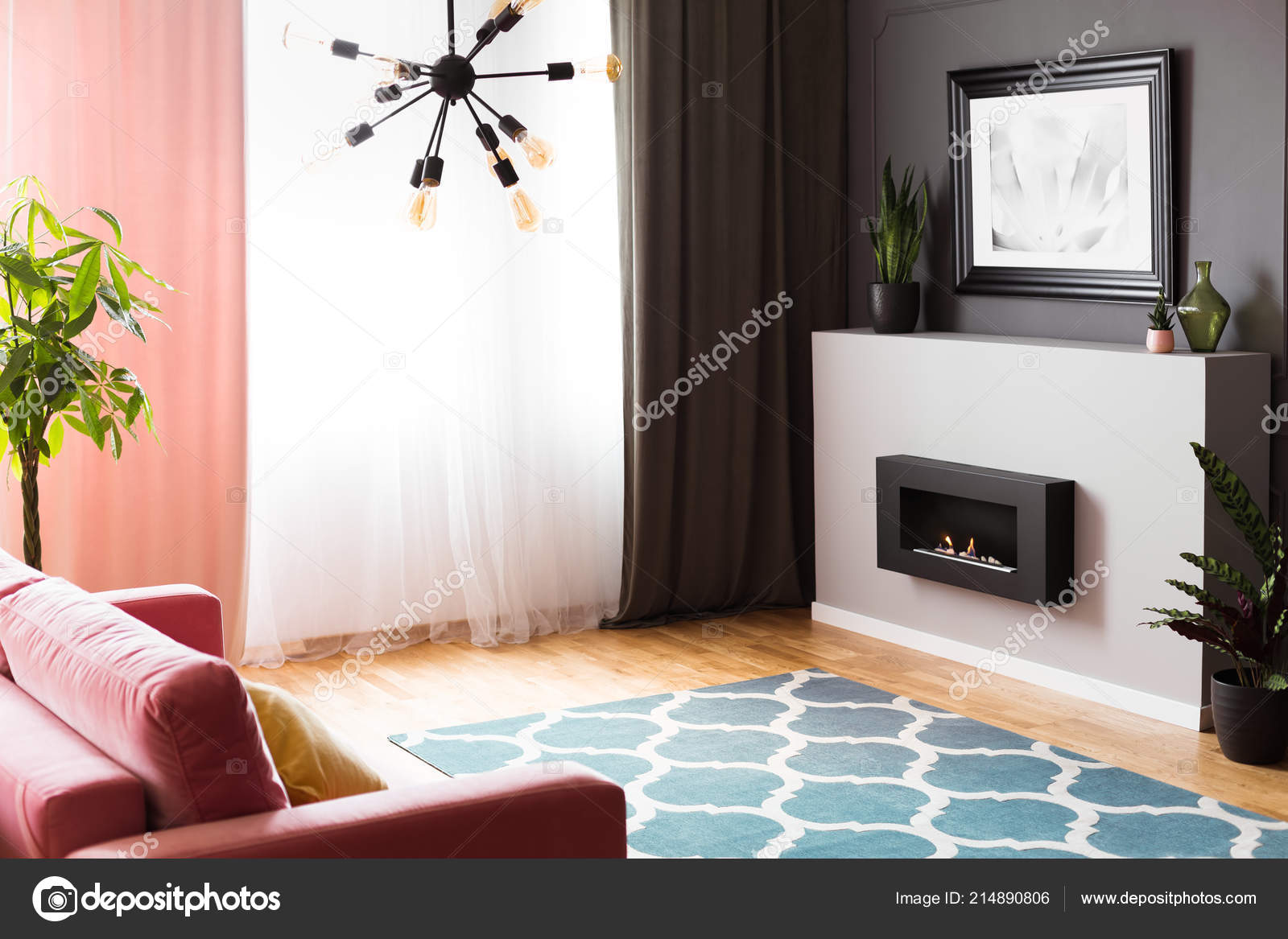 Poster Fireplace Colorful Living Room Interior Pink Sofa Blue