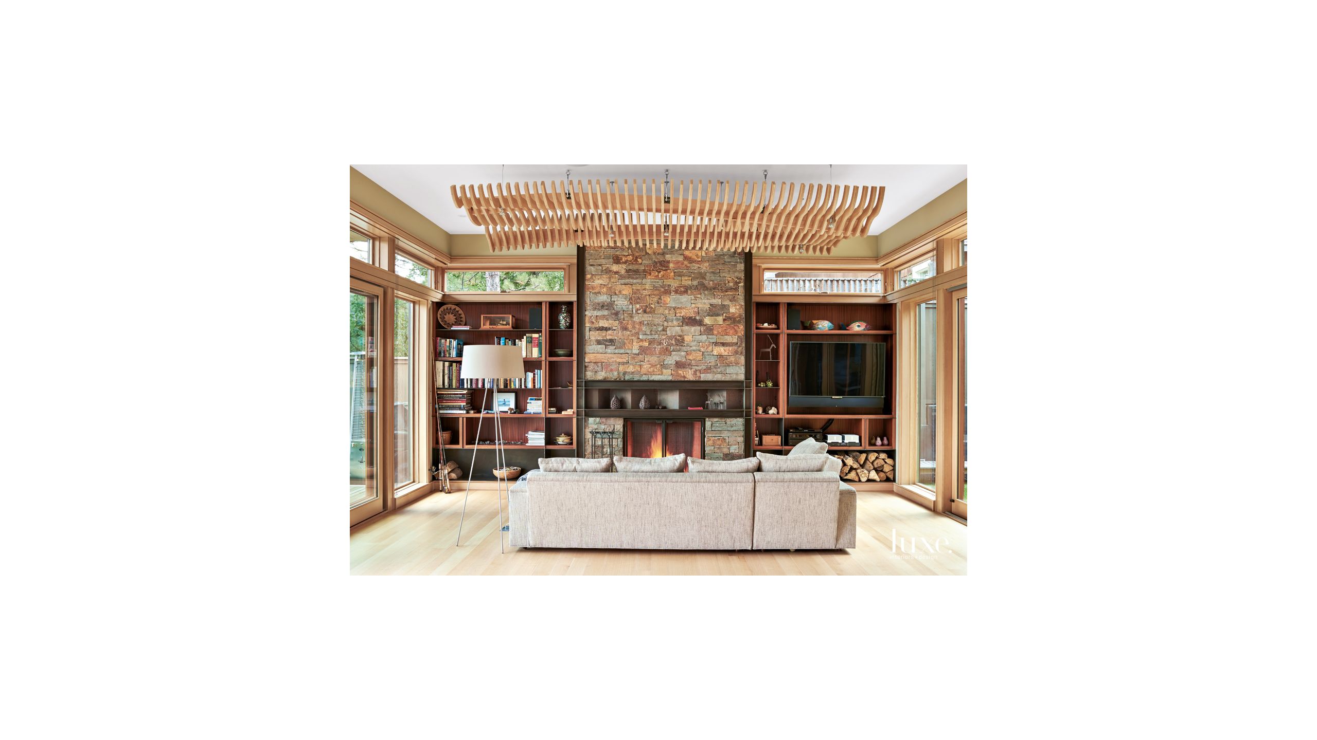 Modern Neutral Living Room With Wood Slat Ceiling Element Luxe