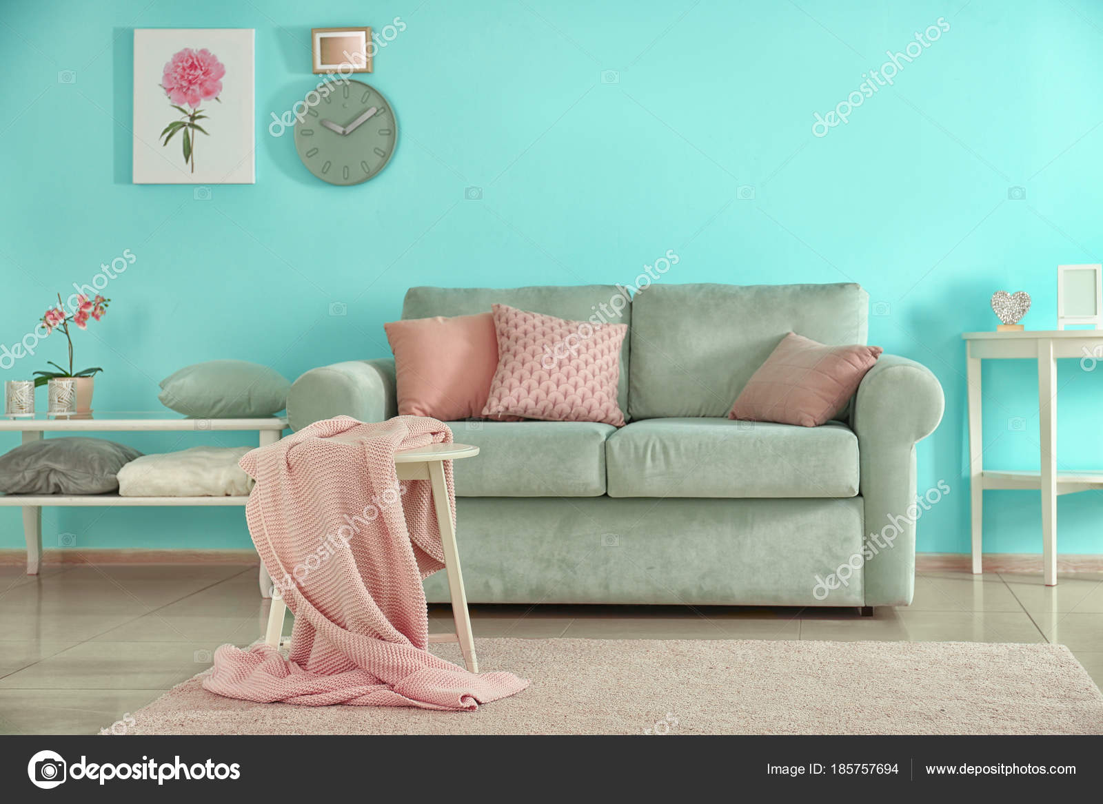 Stylish Living Room Interior With Sofa And Mint Decor Stock Photo
