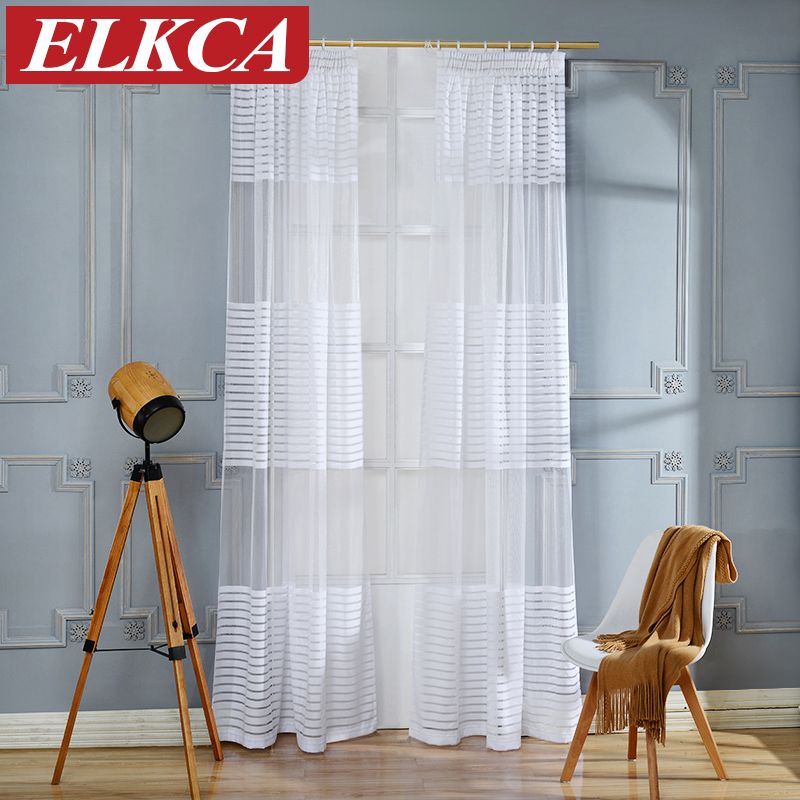 Modern White Striped Sheer Curtain Tulle Curtains Window Drapes