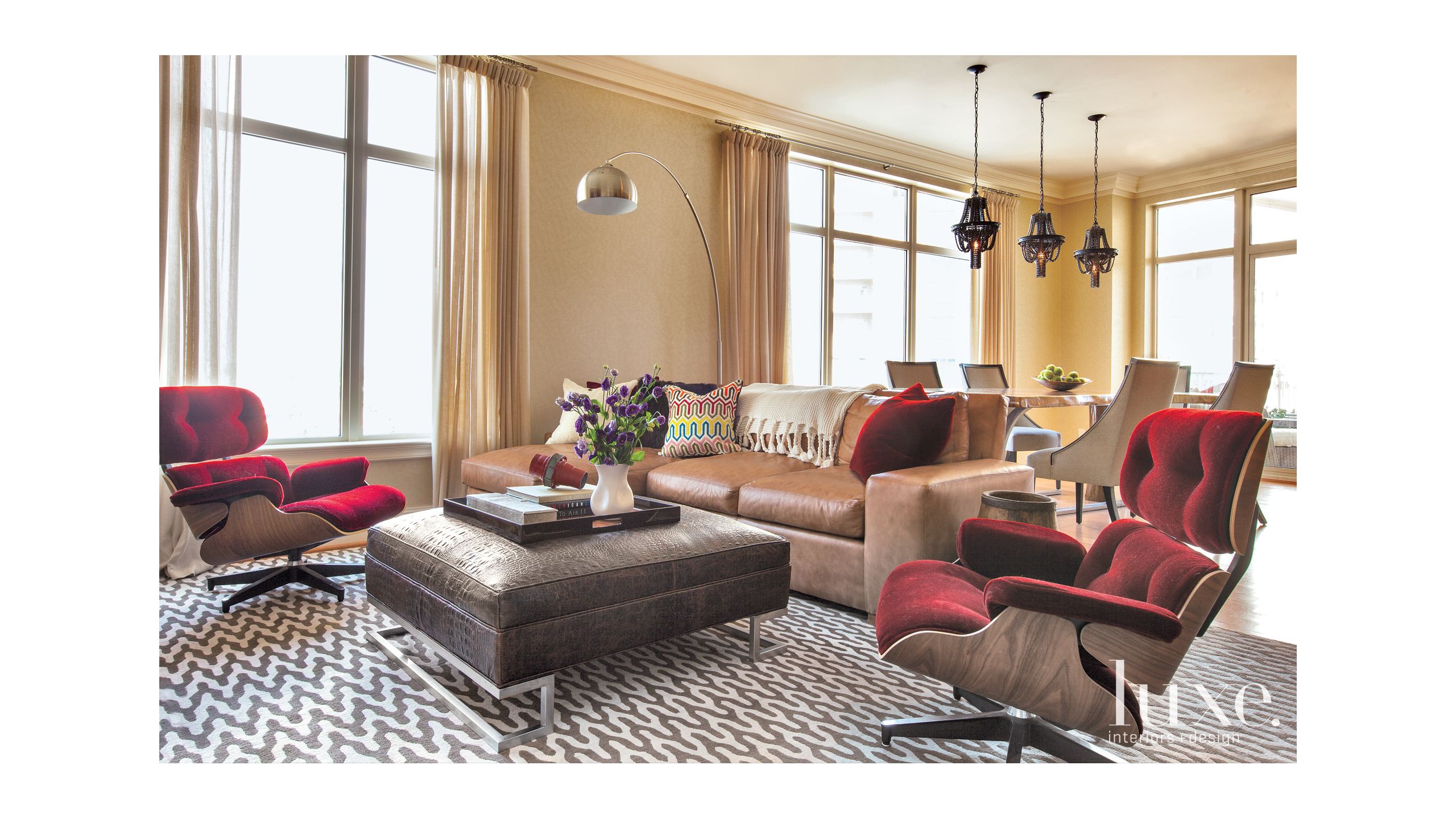 Modern Neutral Living Room With Burgundy Lounge Chairs Luxe