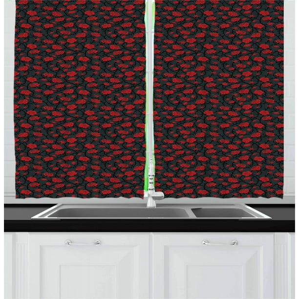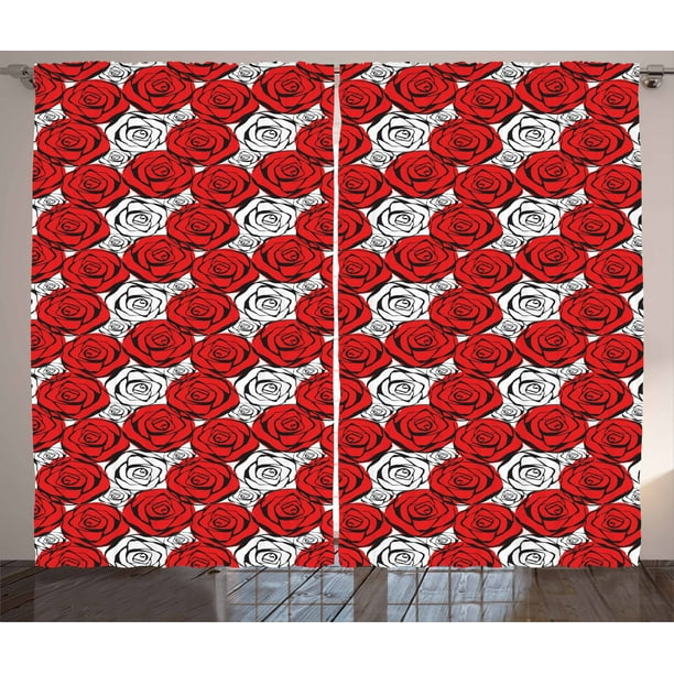 Red And Black Curtains 2 Panels Set Roses With Black Contours In