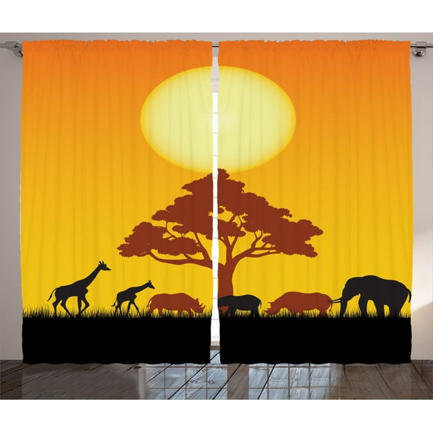 Safari Decor Curtains 2 Panels Set Silhouette Of Rhinos Elephants