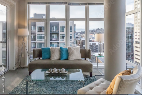 Modern Living Room With Teal Accents And City View Buy This