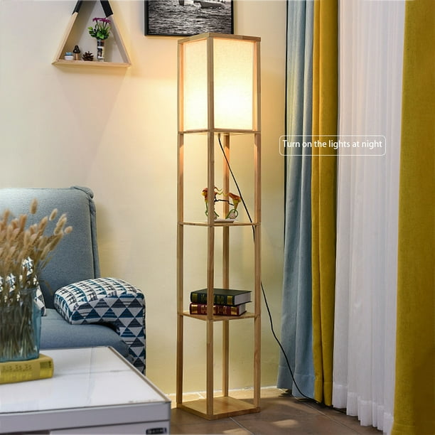 Led Wood Shelf Floor Lamp Linen Shade Light 3 Tier Storage Rack