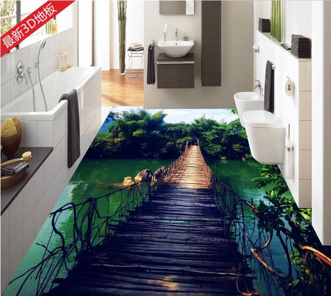 Wooden Bridge Bamboo Sky Water White Clouds Water 3d Floor Tiles