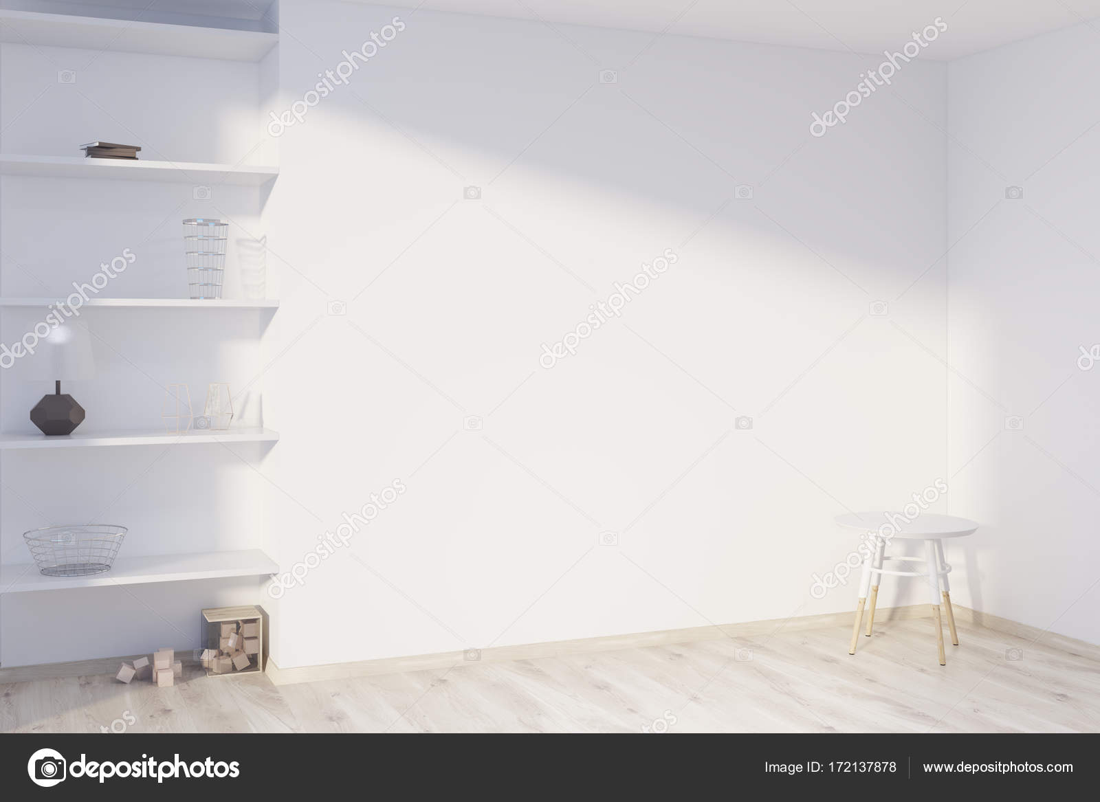 White Living Room Shelves Side View Stock Photo