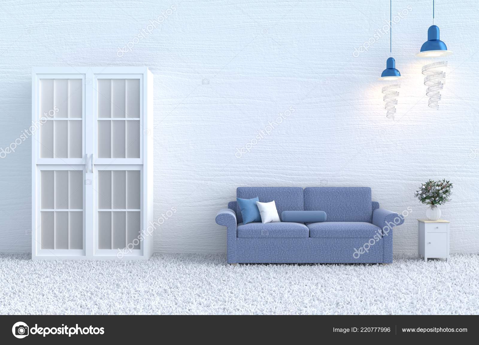 White Living Room Decor Blue Sofa White Wood Wall Pillow Stock