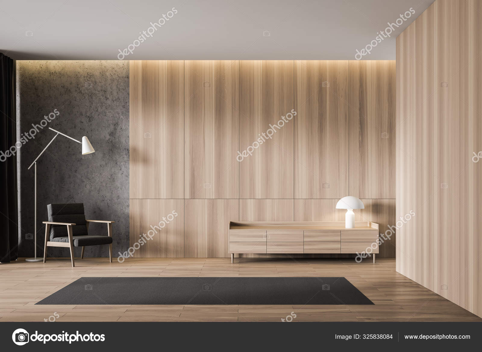 Wooden Living Room With Armchair And Cabinet Stock Photo