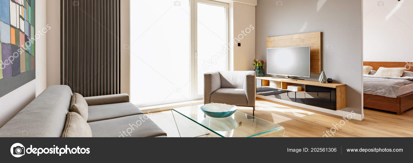 Interior Of Modern Living Room With Gray Walls Wooden Floor