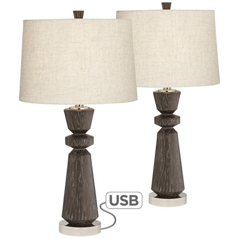 Regency Hill Modern Table Lamps Set Of 2 With Usb Port Natural Wood Grain Oatmeal Drum Shade For Living Room Bedroom Office Family Target